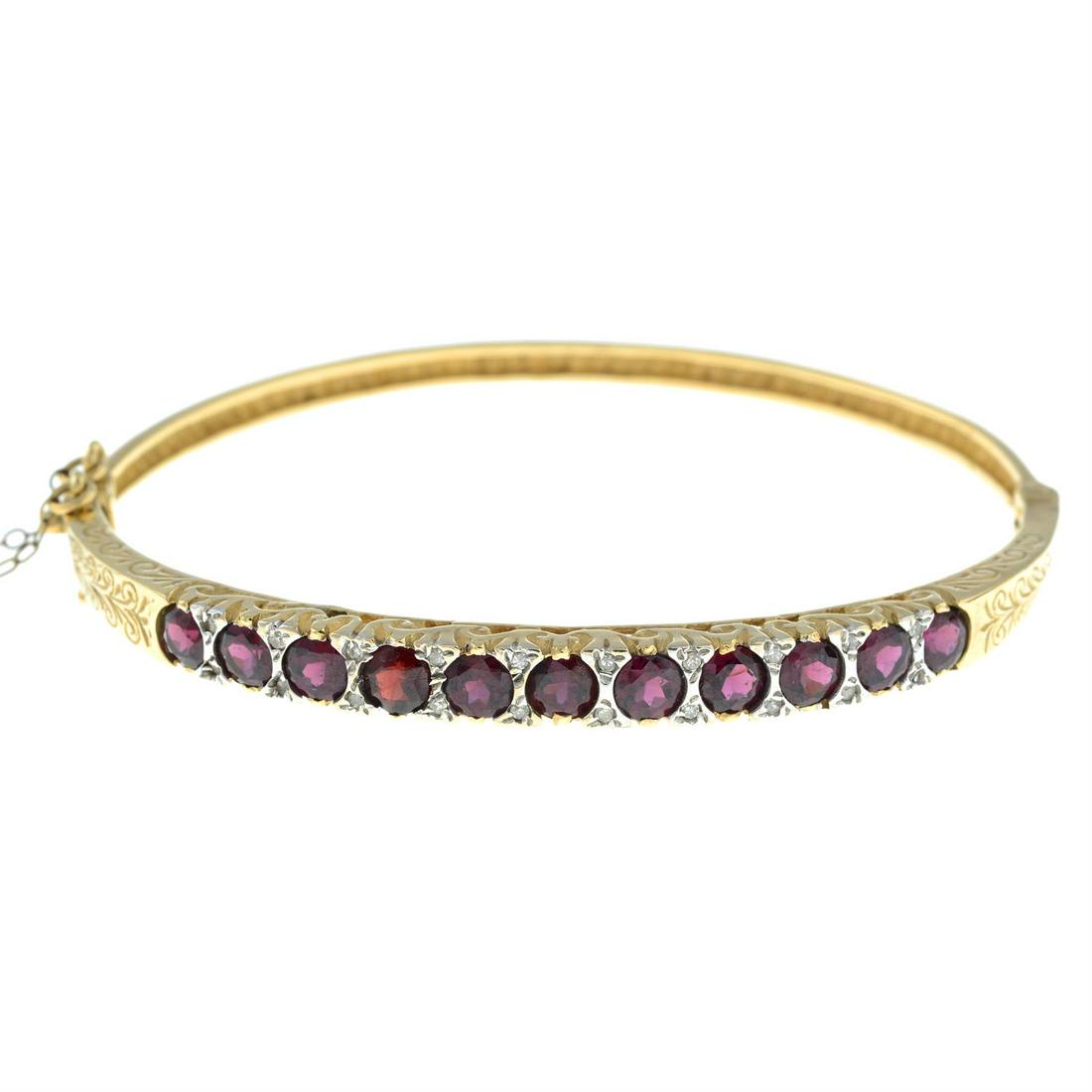 A 9ct gold garnet and single-cut diamond hinged bangle.