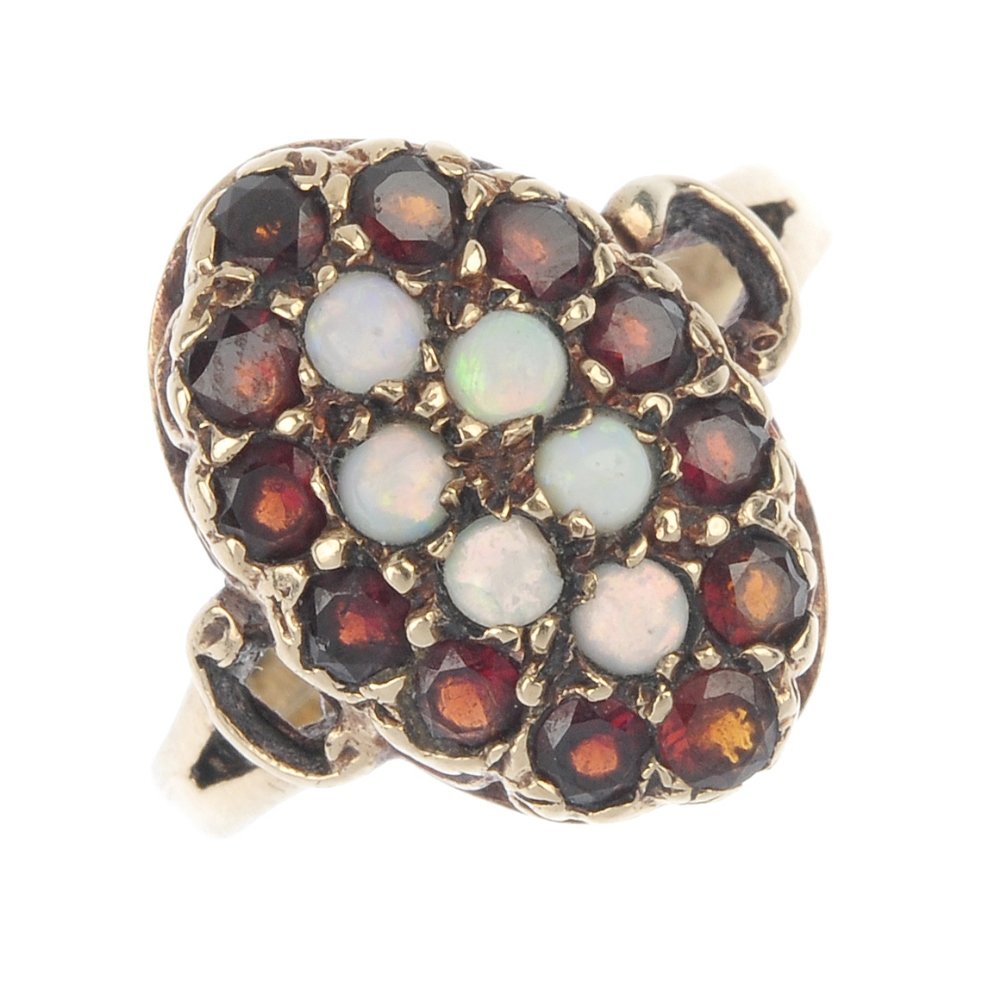 Sold9ct gold opal and garnet row ring (1.3g). K.9ct gold opal and garnet row ring (1.3g). K.See Sold Price