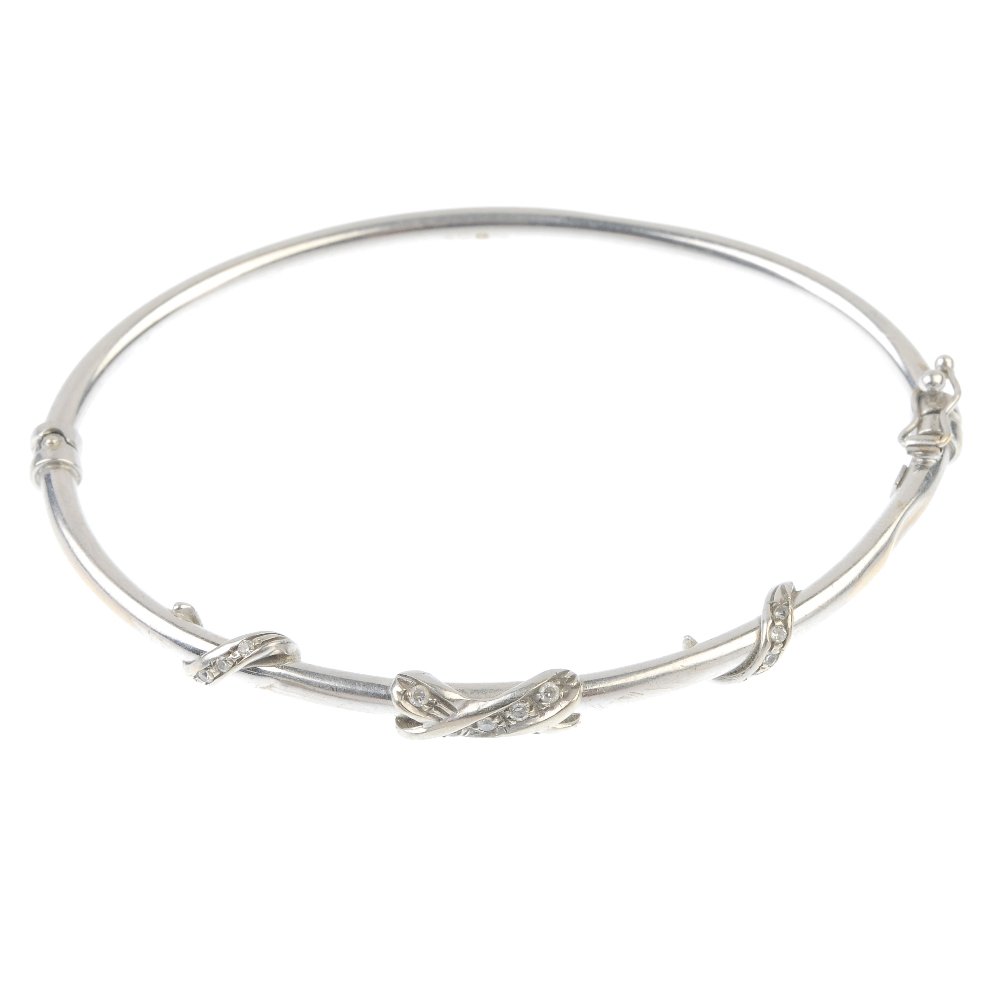 SoldAN ANTIQUE DIAMOND LOVERS KNOT BANGLE in 9ct yellow gold, the hinged bangle comprising a lover'sAN ANTIQUE DIAMOND LOVERS KNOT BANGLE in 9ct yellow gold, the hinged bangle comprising a lover's knot suspending a heart charm set with a round cut diamond, charm stamped 9C, inner circumference 16.0cSee Sold Price