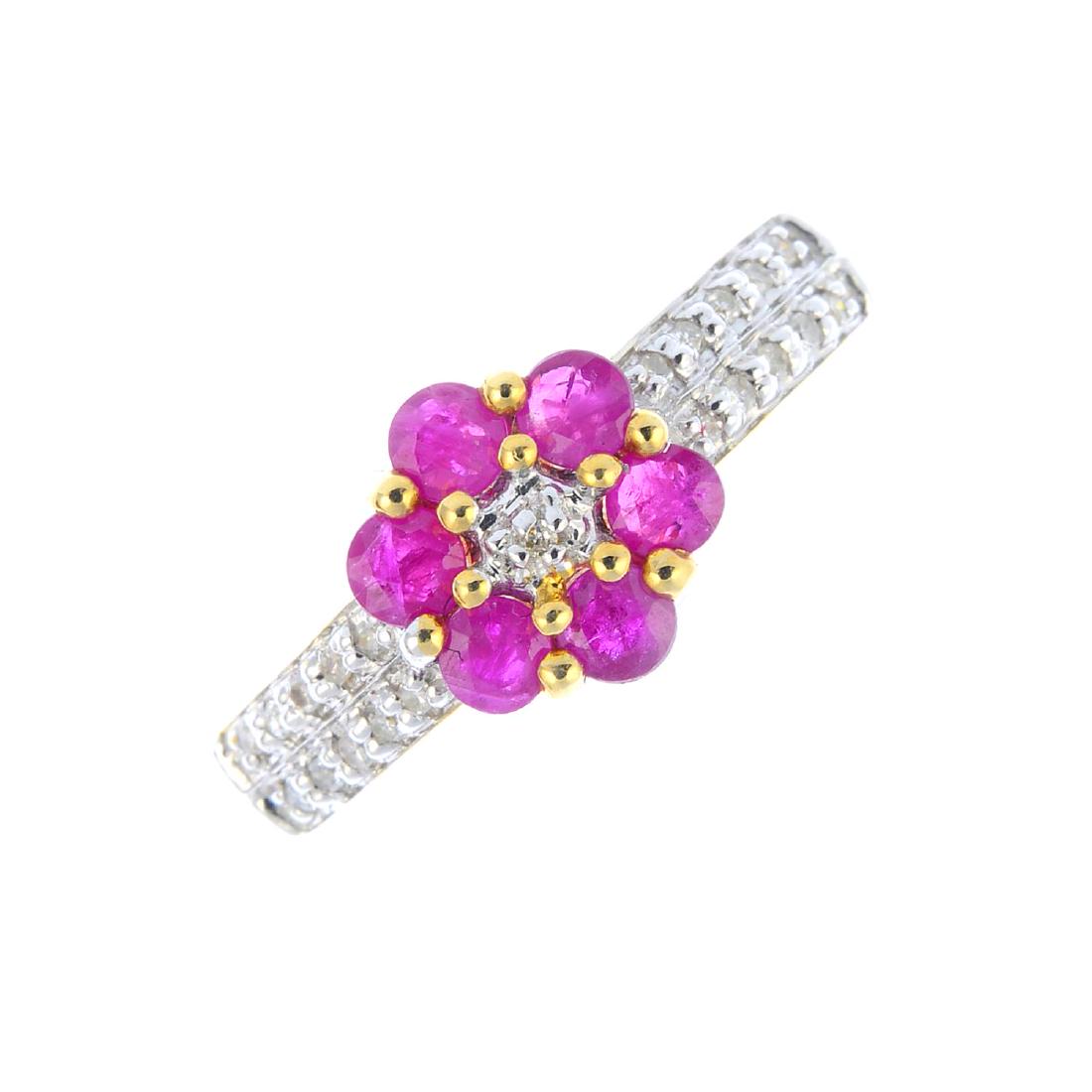 A 9ct gold ruby and diamond cluster ring. Designed a