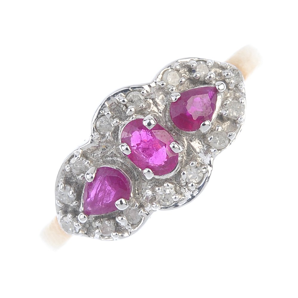 A 9ct gold ruby and diamond cluster ring. The oval and