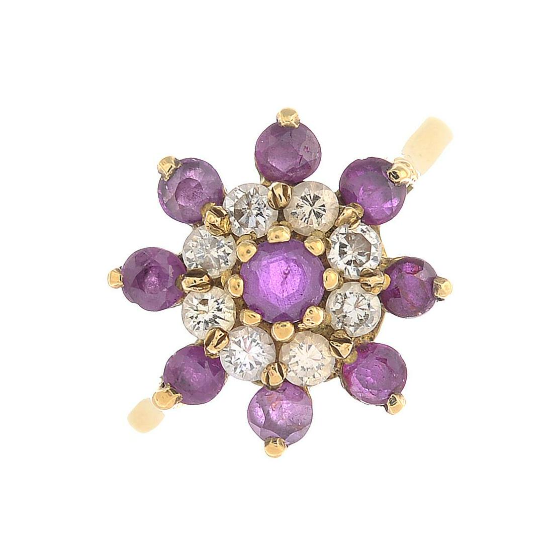 A 9ct gold ruby and diamond cluster ring.Estimated