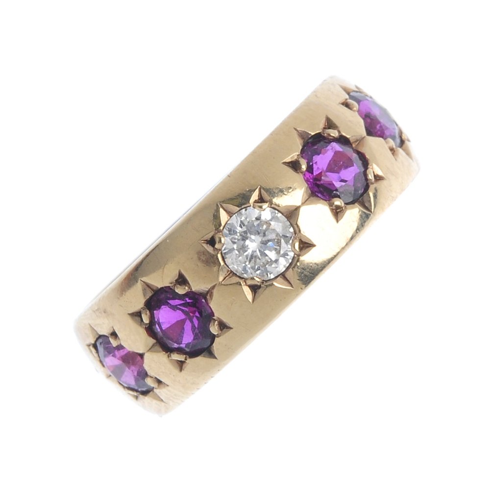 A 9ct gold ruby and diamond ring. The brilliant-cut