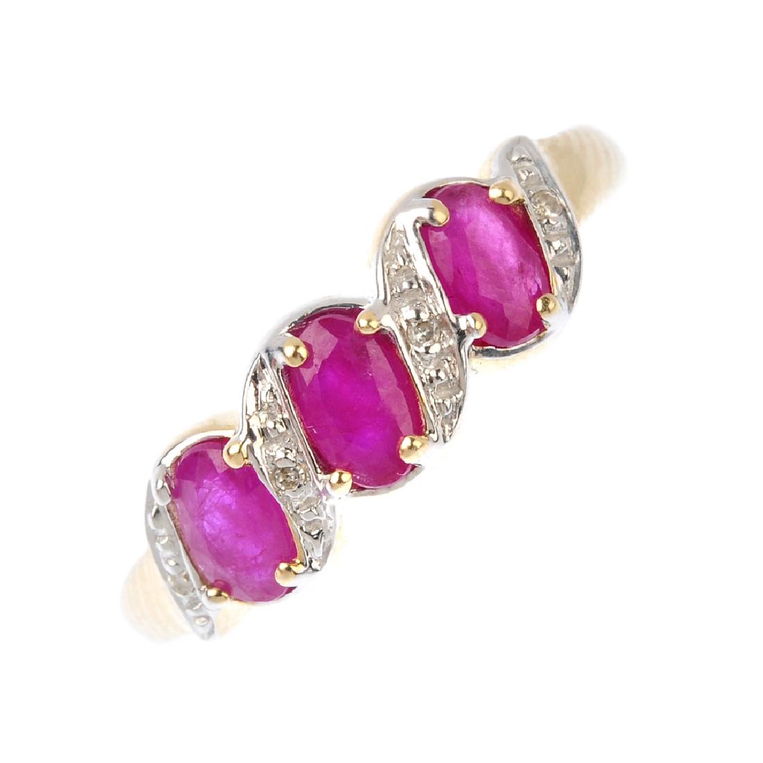 A 9ct gold ruby and diamond ring. The three oval-shape