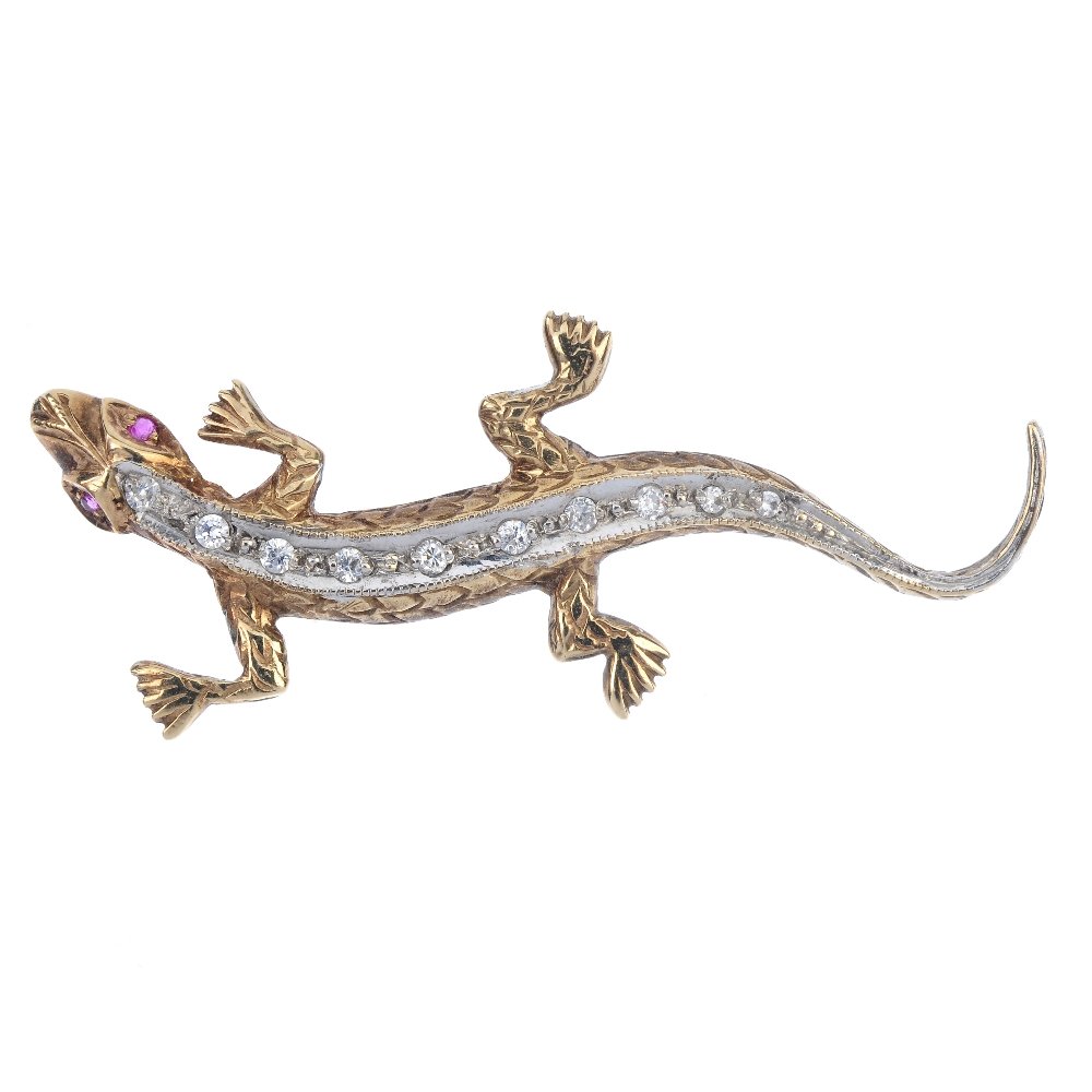A 9ct gold ruby and paste lizard brooch.