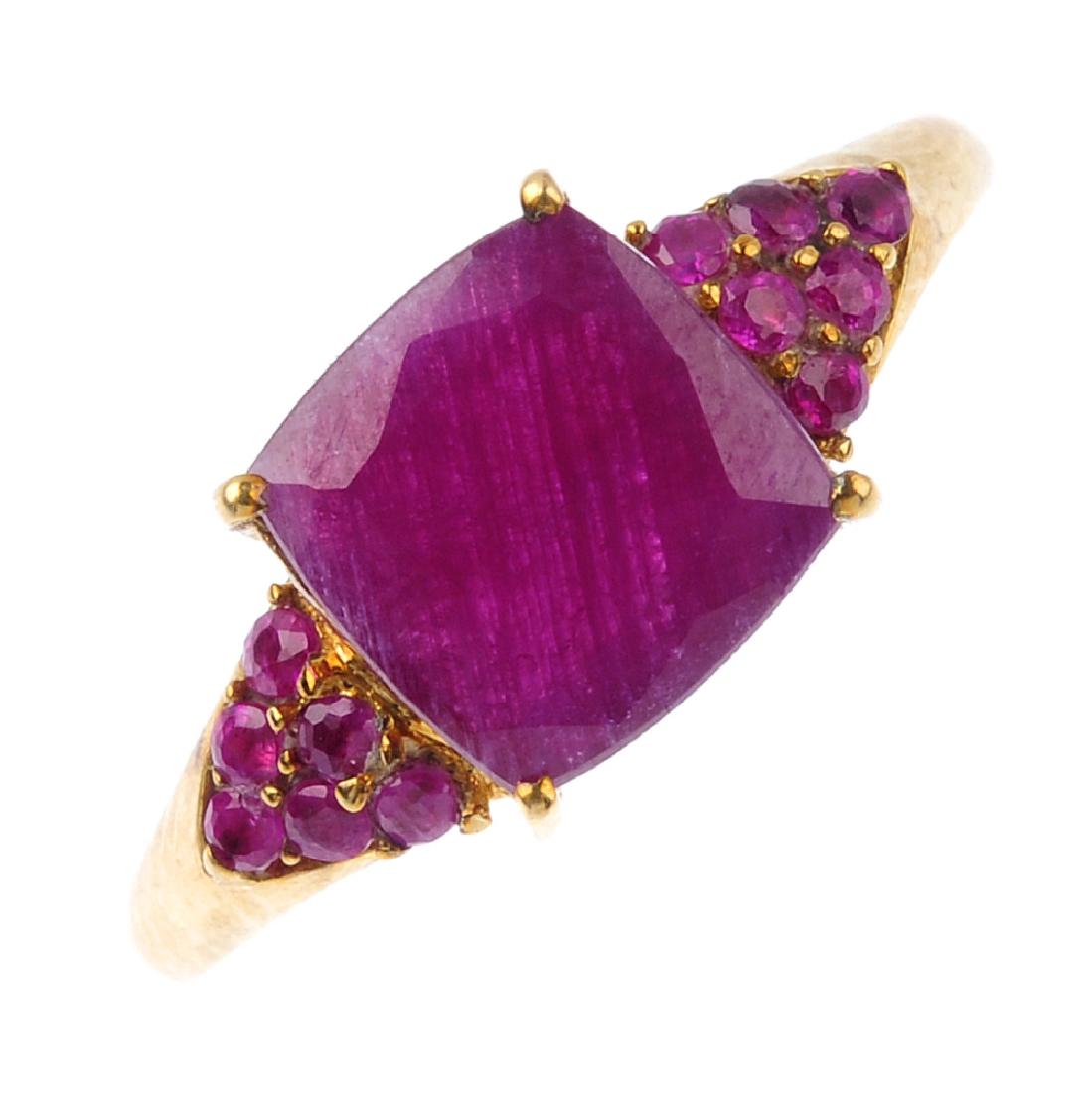 A 9ct gold ruby dress ring. The cushion-shape ruby,