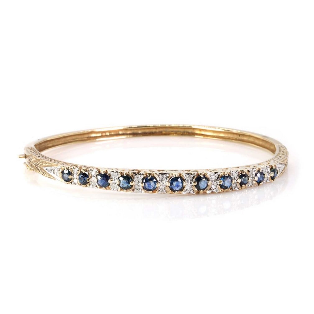 A 9ct gold sapphire and diamond hinged bangle,