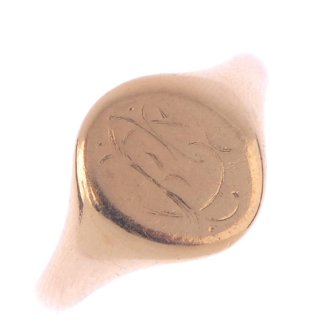 A 9ct gold signet ring. The oval-shape monogram panel,