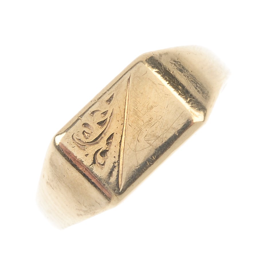 A 9ct gold signet ring. The rectangular-shape panel,