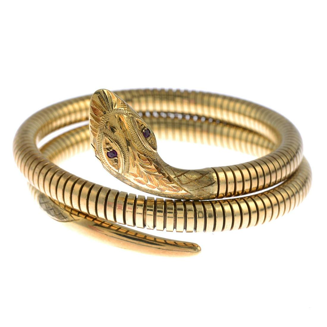A 9ct gold snake bracelet, with ruby eyes.Hallmarks for