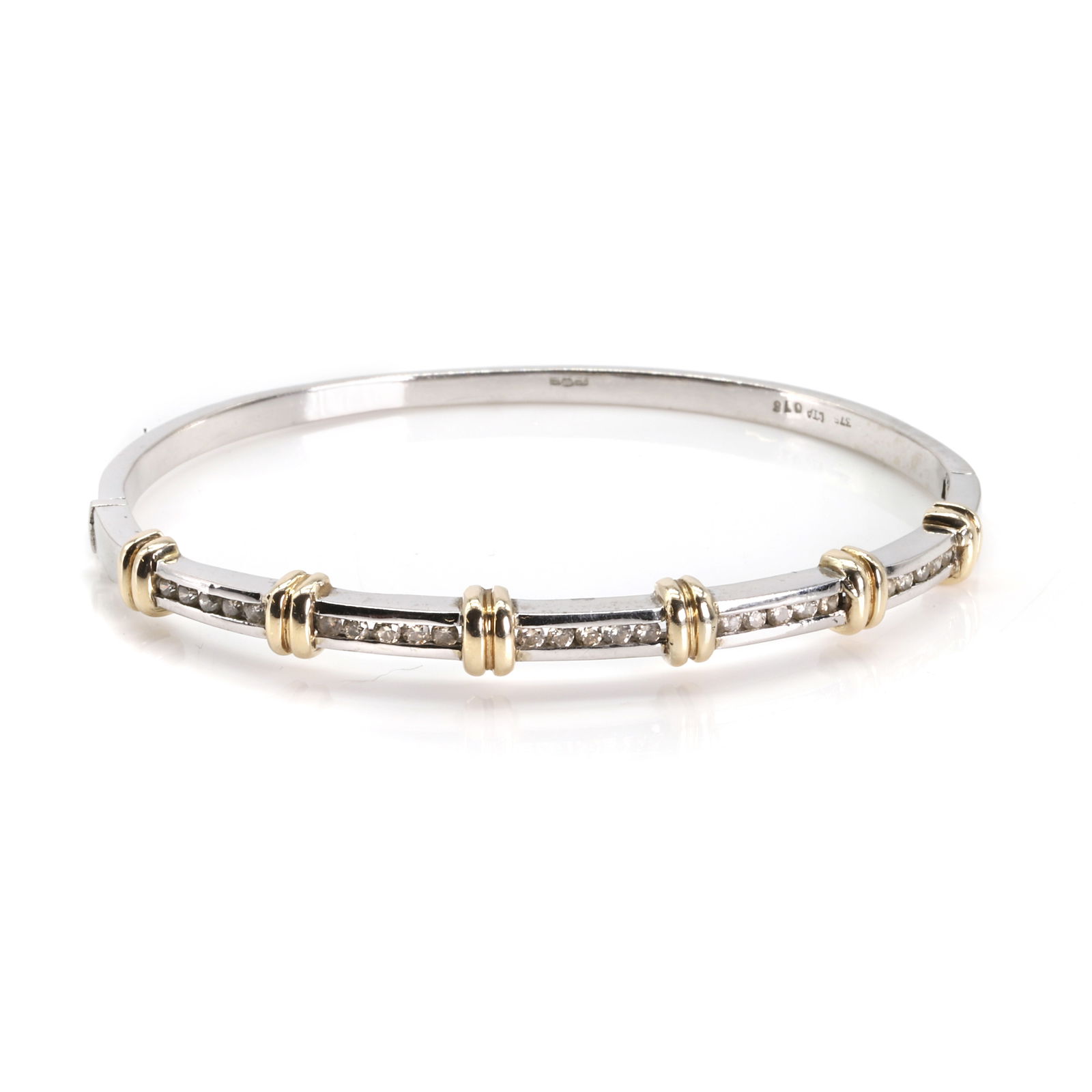 A 9ct two colour gold diamond hinged bangle,