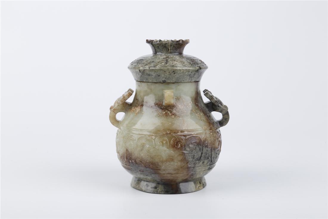 A ANTIQUE JADE TWO-EAR LIDDED POT
