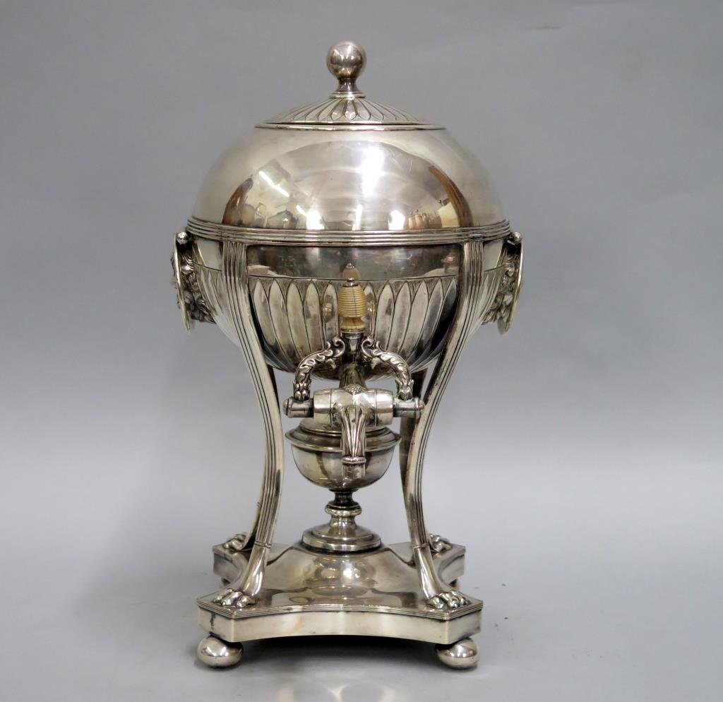 SoldA. B. Rogers Silver Plated BurnerRound container with lion head mounts and paw feet. Urn form burner, ball feet. Snuffer included. Wear consistent with use. As is. 9.5W X 11.5"D X 16"H. (From a Great Neck, NY Estate)"See Sold Price