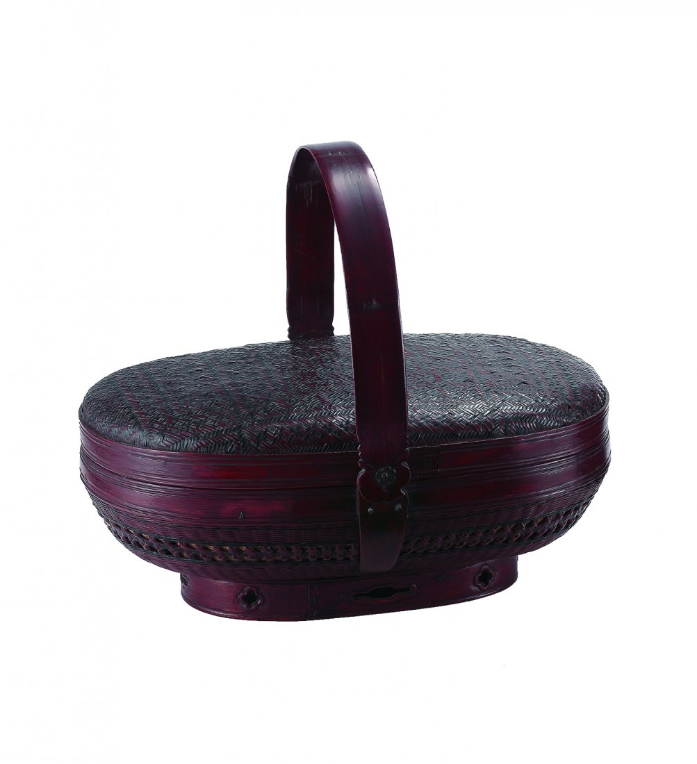 SoldChinese bamboo basket, 19th c.mounted with pierced bronze ornaments; basket cover decorated with a lacquer panel painted with a landscape scene; 12in(H) x 7in(L) x 7in(W)See Sold Price