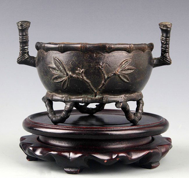 BAMBOO STYLE BRONZE INCENSE BURNER WITH BASE