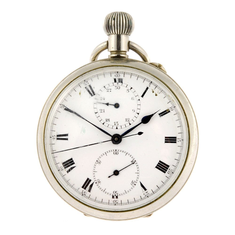 SoldAn 18K gold open face keyless wind chronograph pocket watch Chronographe de poche à cadran ...An 18K gold open face keyless wind chronograph pocket watch Chronographe de poche à cadran ouvert en or jaune 18K (750) remontoir au pendant Date: Circa 1890 Movement: Gilt full plate, English leSee Sold Price