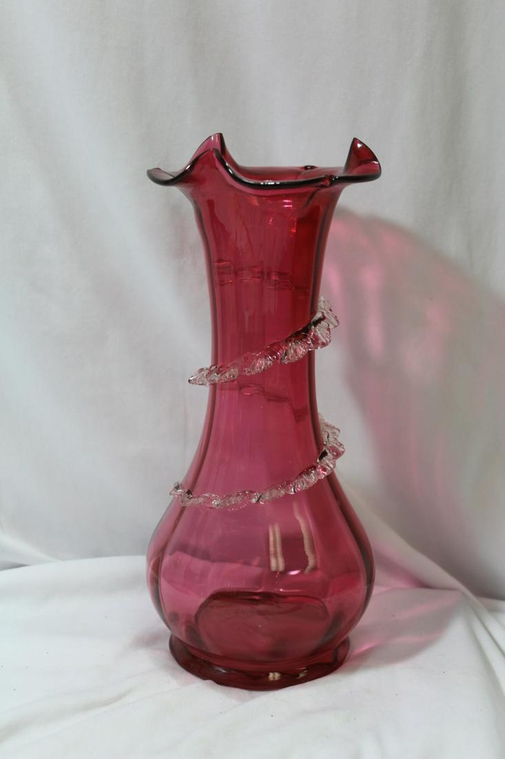 SoldBeautiful Cranberry Hand Blown Art Glass VaseBeautiful cranberry ruffled top art glass vase. Hand blown. White dot accents. No chips or cracks. Approximately 12"h. Photos are considered part of the condition and description. 413-31See Sold Price