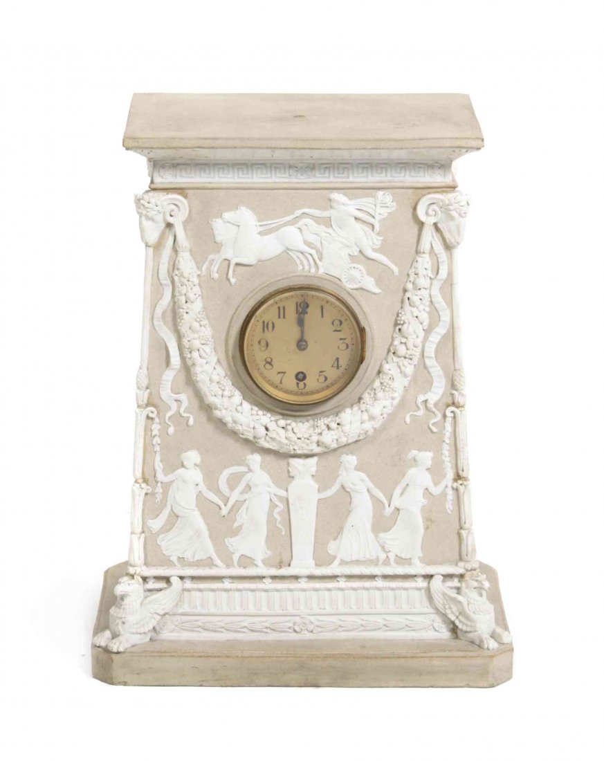 A Bisque Porcelain Mantel Clock, Height 15 x width 11