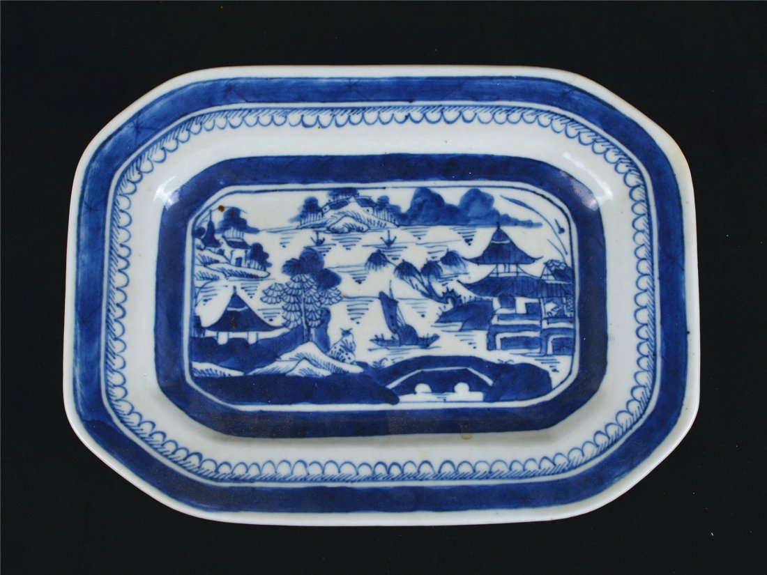 A BLUE AND WHITE LANDSCAPE SQUARE DISH