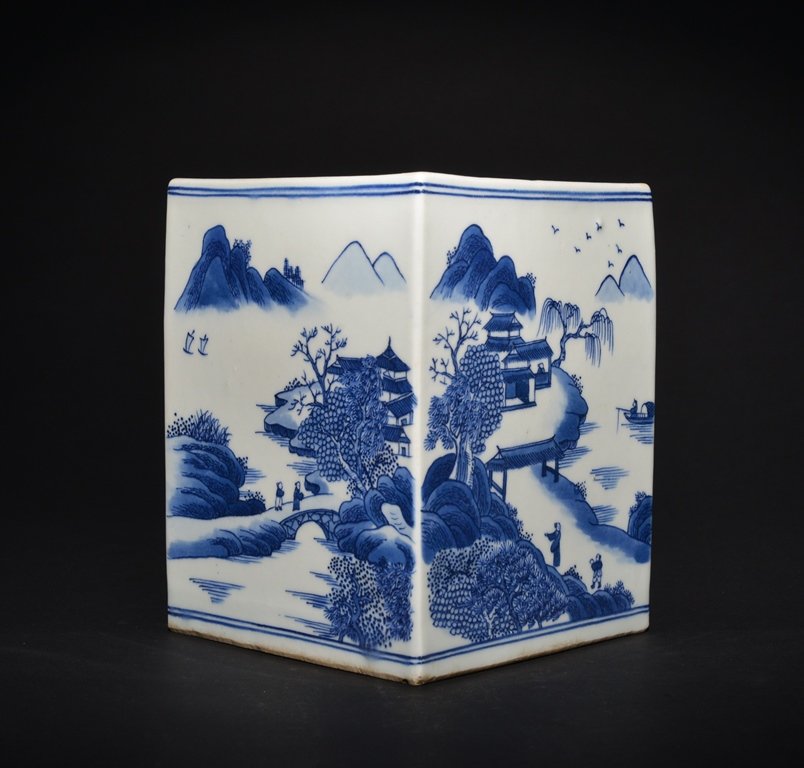 A BLUE AND WHITE SQUARE BRUSHPOT