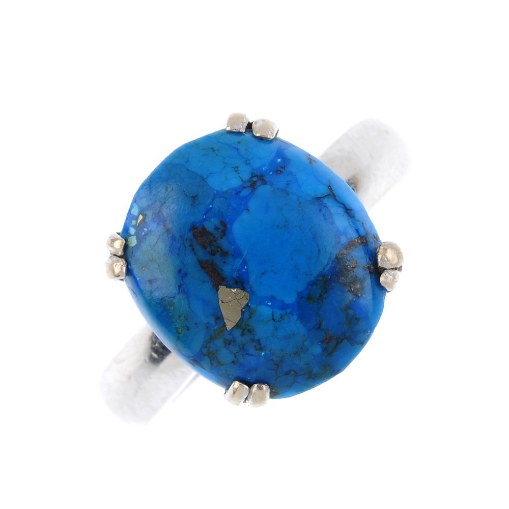 A blue-gem single-stone ring. The oval blue-gem
