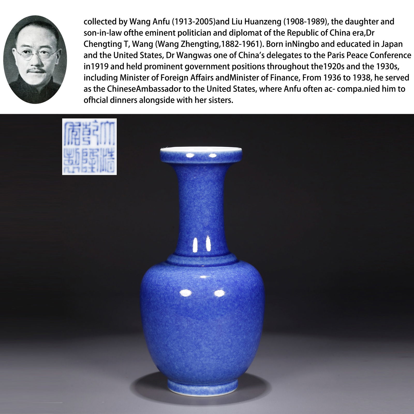 SoldA CHINESE BLUE GLAZED PORCELAIN VASEA CHINESE BLUE GLAZED PORCELAIN VASE The bottle has a sharp mouth, long neck, sloping shoulders, spherical abdomen, round feet, regular body shape, blue glaze on the outer wall, the glaze is even andSee Sold Price