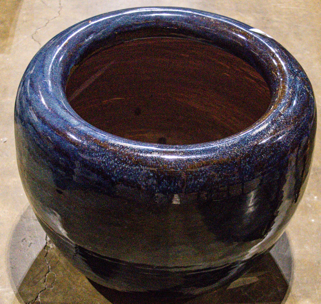 A blue glazed ceramic garden planter