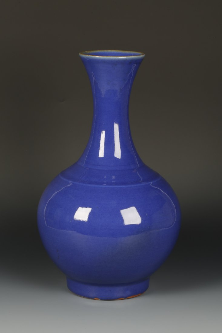 A BLUE-GLAZED VASE with a flared neck and spherical
