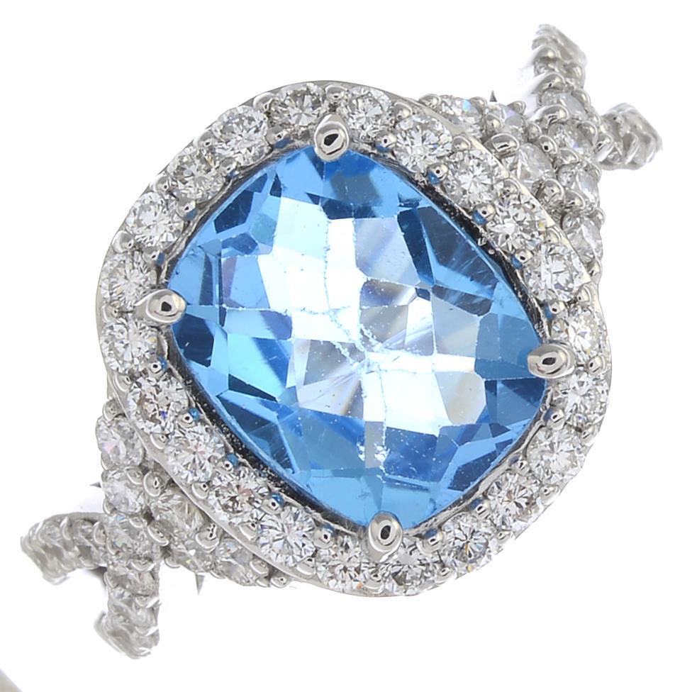 A blue topaz and diamond cluster ring. Topaz calculated