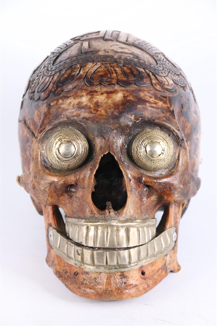 A BONE SKULL HEAD, INLAID WITH SILVER.
