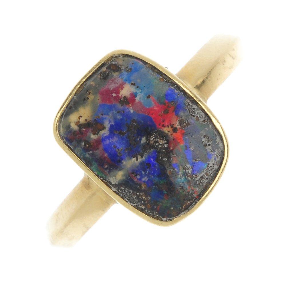 SoldA yellow metal and boulder opal dress ring; the oblique shaped rectangular plaque within a texturedA yellow metal and boulder opal dress ring; the oblique shaped rectangular plaque within a textured mount and set above a textured fold-formed shank. Italian hallmarked '750' and signed J.L. Ring headSee Sold Price