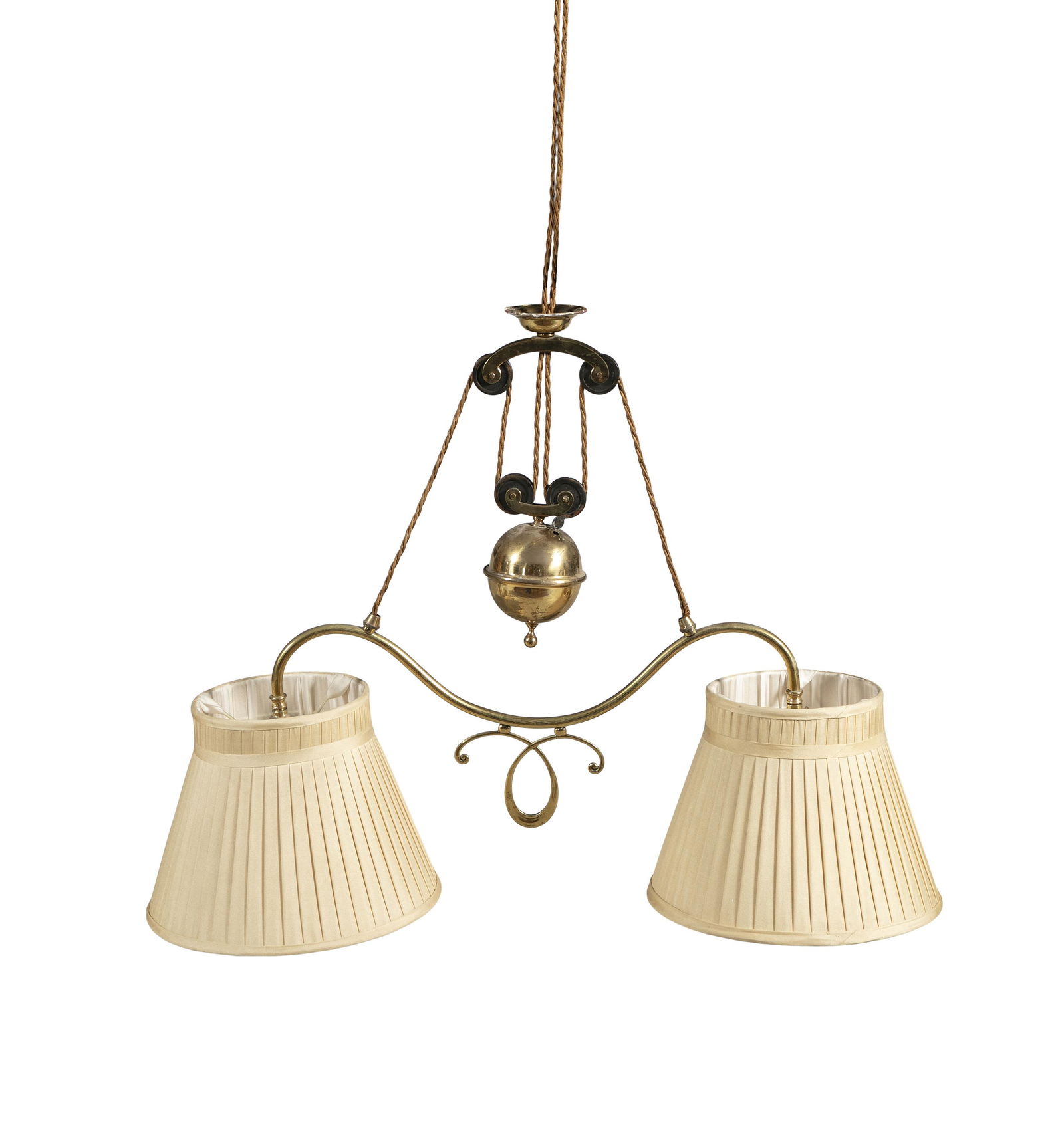 A BRASS 'PULLY' CEILING LIGHT, the twin lights with
