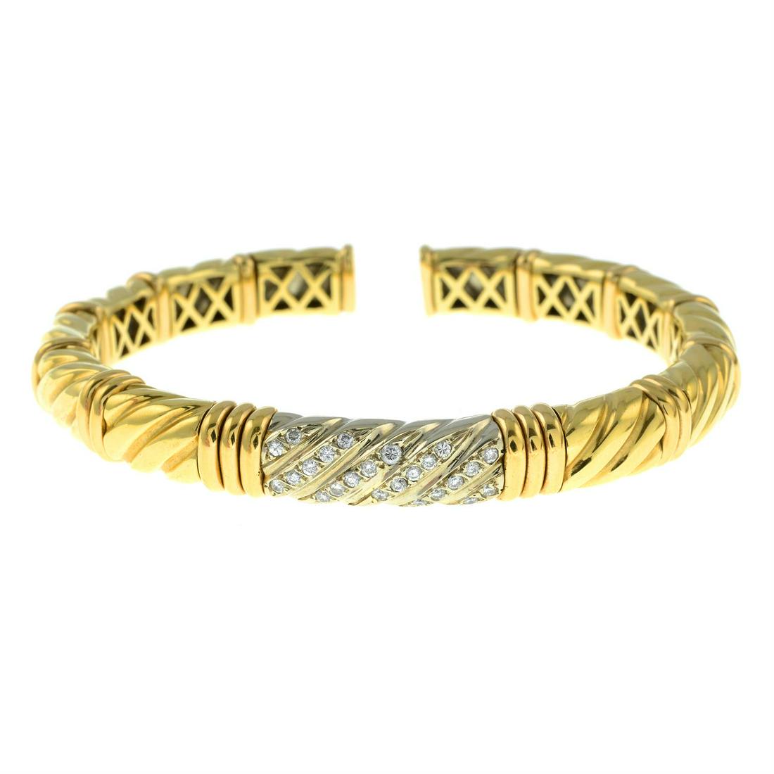 Sold18k Yellow Gold and Round Cut Diamond Cuff Bracelet18k yellow gold and round cut diamond cuff bangle bracelet. 15 round diamonds to the cuff measuring 2.8mm. Marked 18k to the interior. Weight Approx., 23 grams Measures Approx., Length 6.25 inches / DSee Sold Price