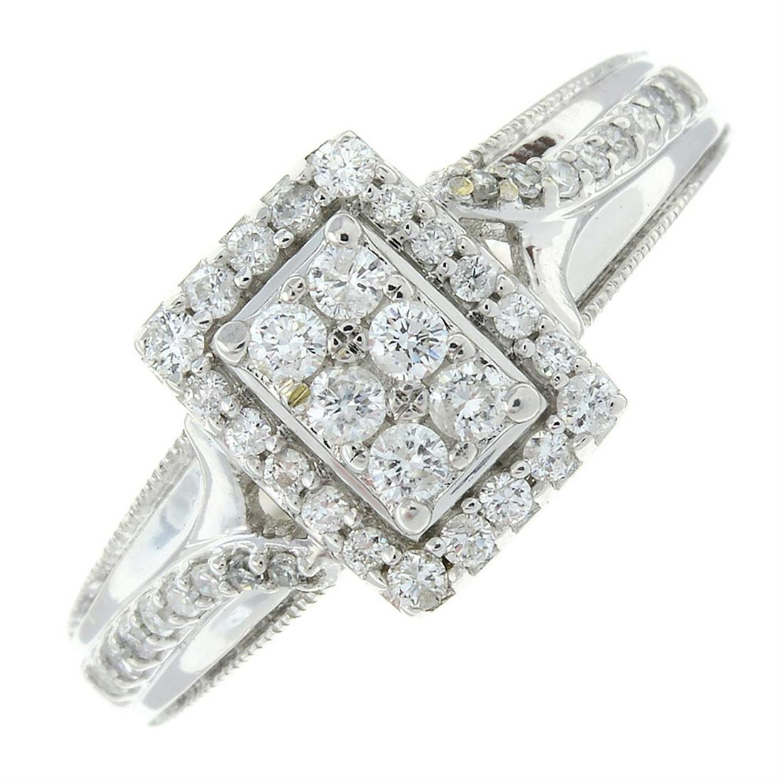 A brilliant-cut diamond rectangular-shape cluster ring, with single-cut diamond sides.