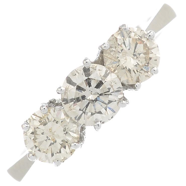 A brilliant-cut diamond three-stone ring.Total diamond