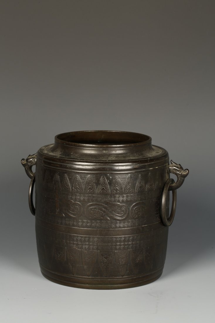 A BRONZE CYLINDRICAL VESSEL with archaistic decoration,