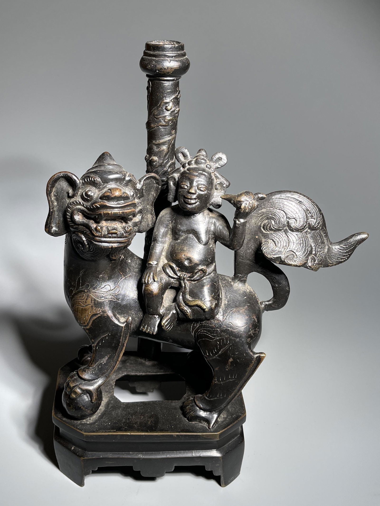 A BRONZE LION CANDLE HOLDER
