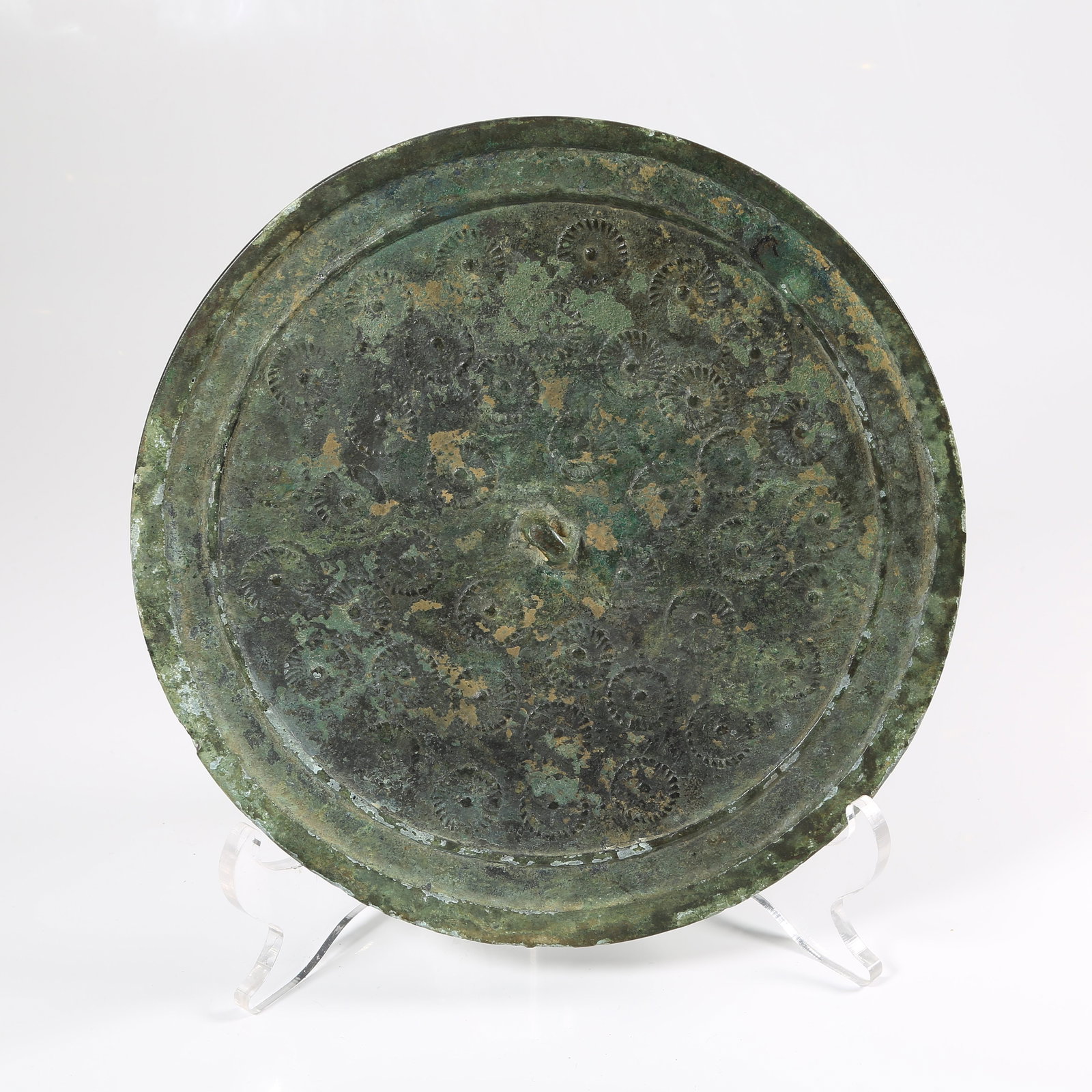 A BRONZE MIRROR WITH ROSETTE MOTIF