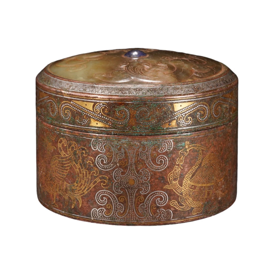 A Han Dynasty copper box with gold and silver beast pattern round three-legged lid boxAdmirable Collections4.6(79)$1006 days Left