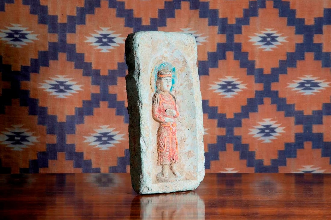 SoldCHINESE NORTHERN WEI DYNASTY TERRACOTTA BRICKC. 386-534 AD. Northern Wei Dynasty. A brick featuring four painted Buddhas within an arched recess. All four Buddhas wear red robes, and sit cross legged atop a dark-coloured carpet, and against a daSee Sold Price