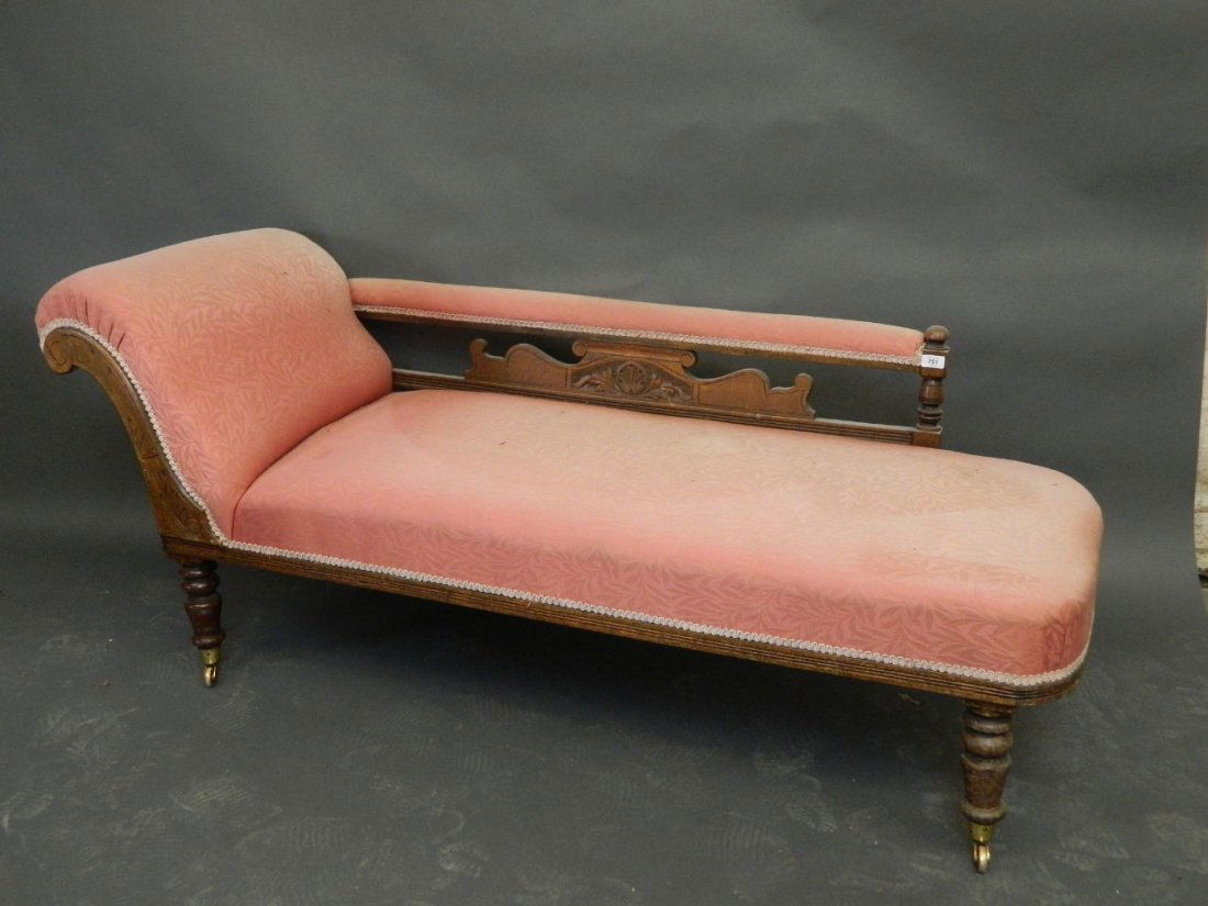 A C19th walnut framed scroll end chaise longue on
