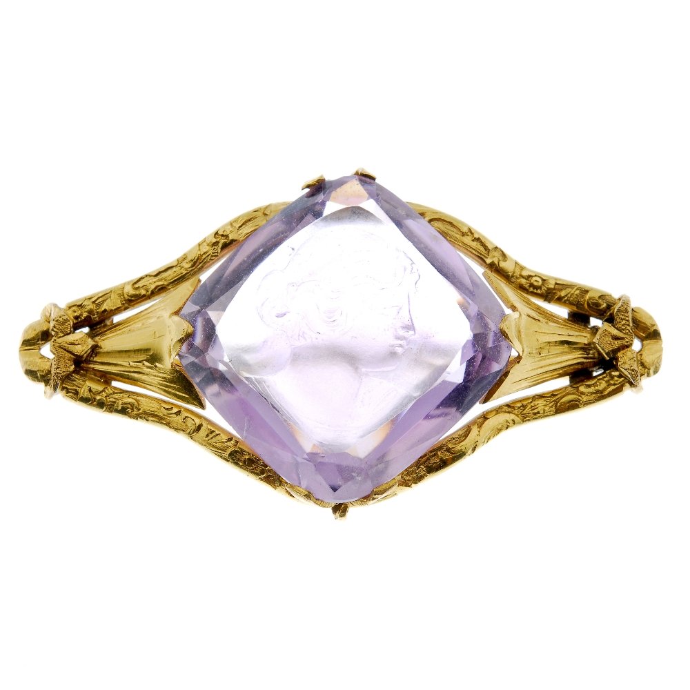 A carved amethyst brooch.