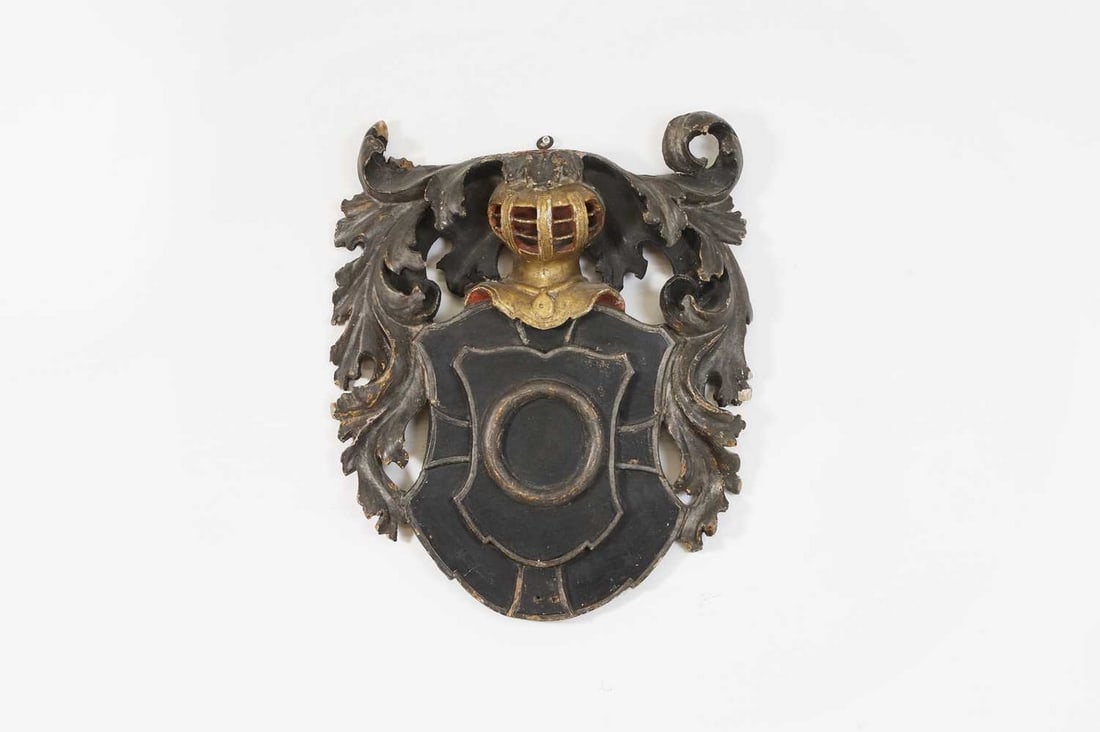 A carved and painted armorial crest,