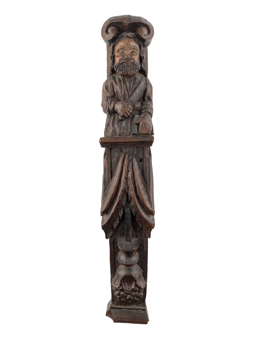 A Carved Oak and Polychrome Decorated Figural Pilaster