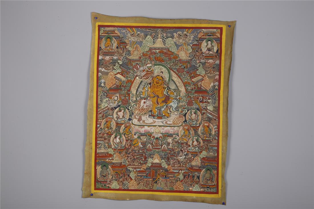 A CATTLEHIDE VAISRAVANA BUDDHA THANGKA.
