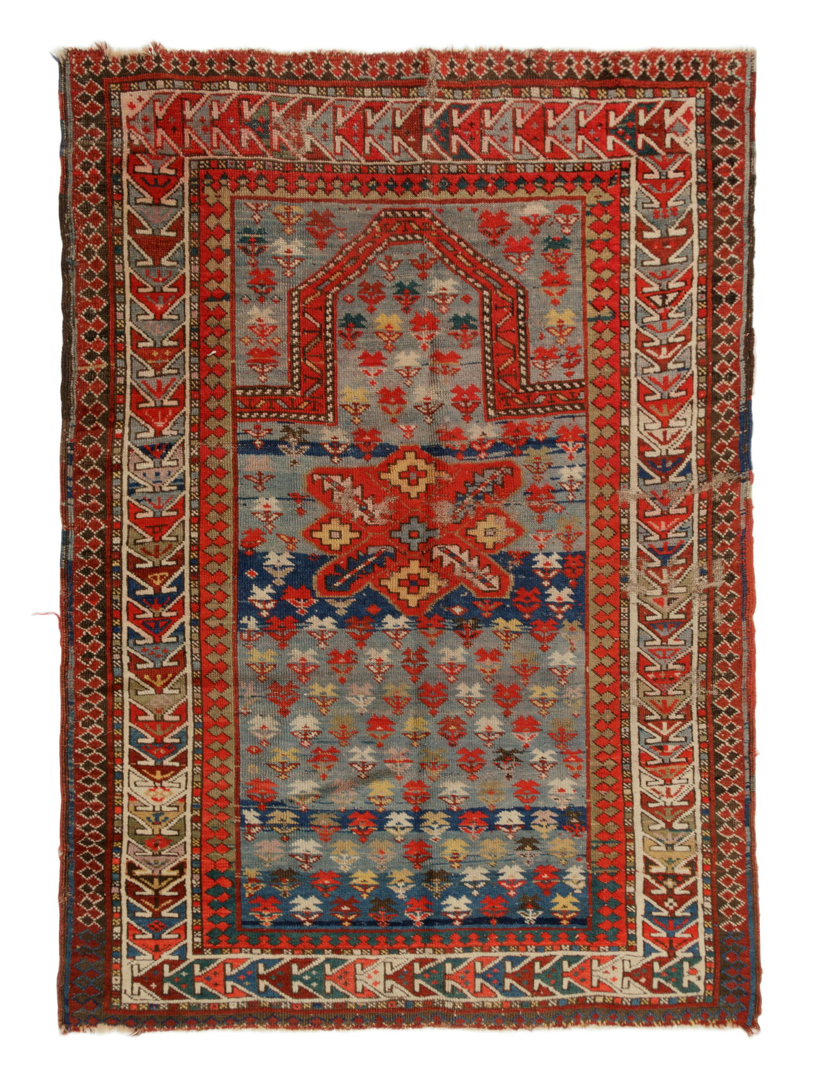 SoldDAGESTAN HANDWOVEN WOOL PRAYER RUGDAGESTAN HANDWOVEN WOOL PRAYER RUG, C. 1870S, W 3', L 5' 6" Antique prayer rug from the Dagestani region, or the Eastern Caucasus (Russia). Figure in the arched top or niche of the rug.See Sold Price
