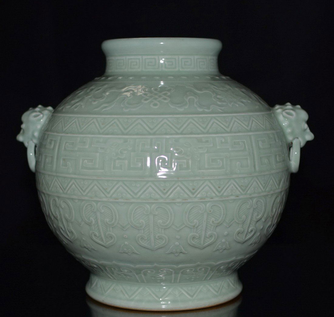 A CELADON GLAZE CARVED JAR