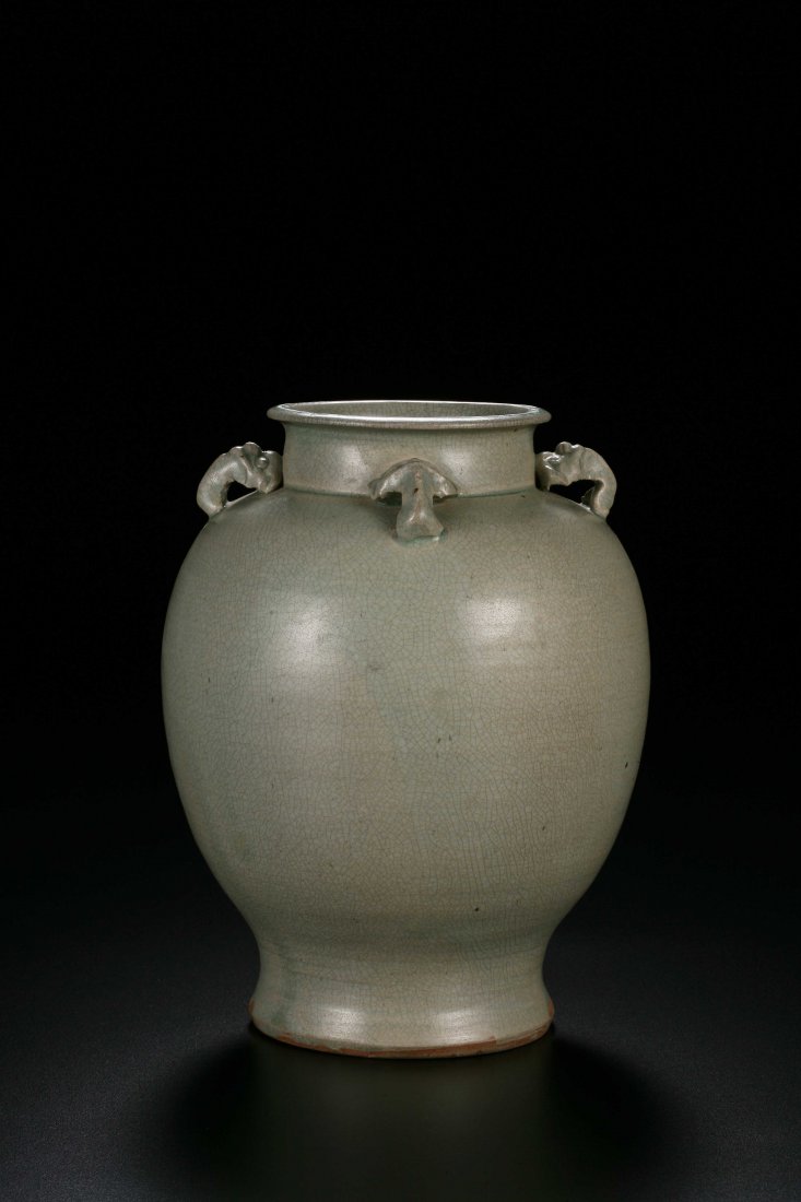 A CELADON-GLAZED JAR WITH FOUR HANDLES