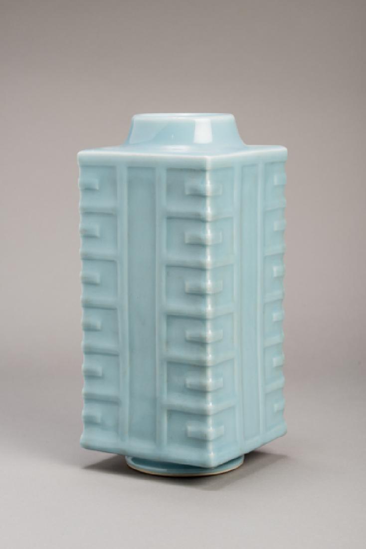 SoldChinese Celadon Glazed Porcelain Cong Vase with ArChinese Celadon Glazed Porcelain Cong Vase with Archaistic Decoration H: 9 1/2 inches W: 4 inchesSee Sold Price