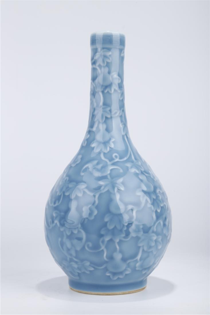 SoldA CELESTE GLAZED PORCELAIN BOTTLE "MEIPING".Celeste Glazed Porcelain Bottle "Meiping" with Carved Dragon Design.See Sold Price
